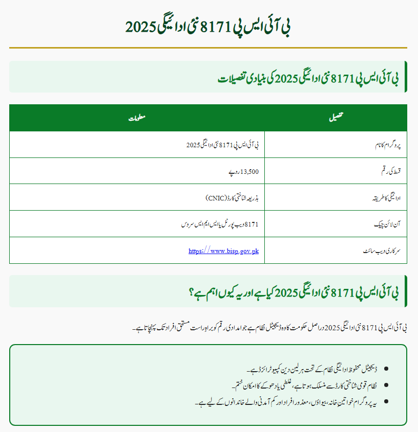 The BISP 8171 New Payment 2025 system is a digital financial assistance program designed to ensure that cash transfers reach the most deserving families directly.