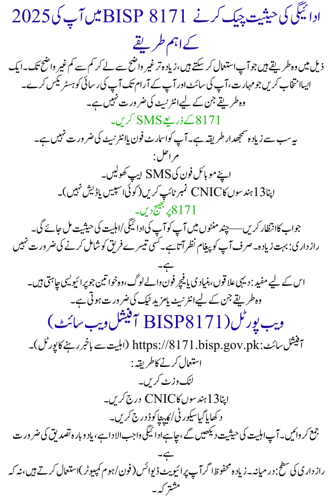 • New Cards / Banking Options: There are reports that new BISP / 8171 cards are being issued in certain regions in 2025, allowing better ATM / POS admission to expenses.