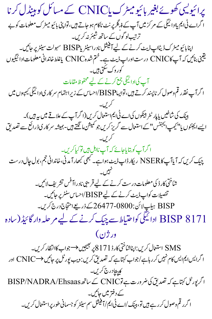 • Make sure your CNIC is valid and updated. Expired CNIC or wrong family info can block payments.